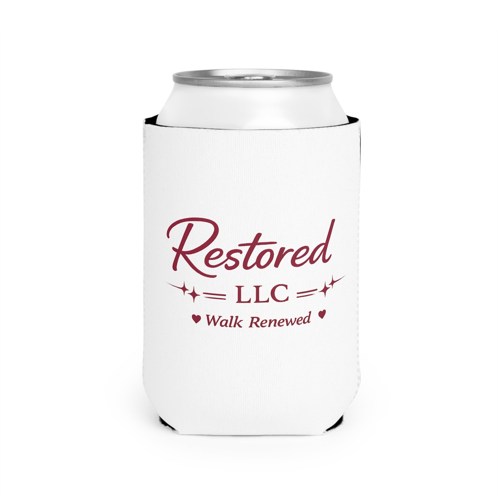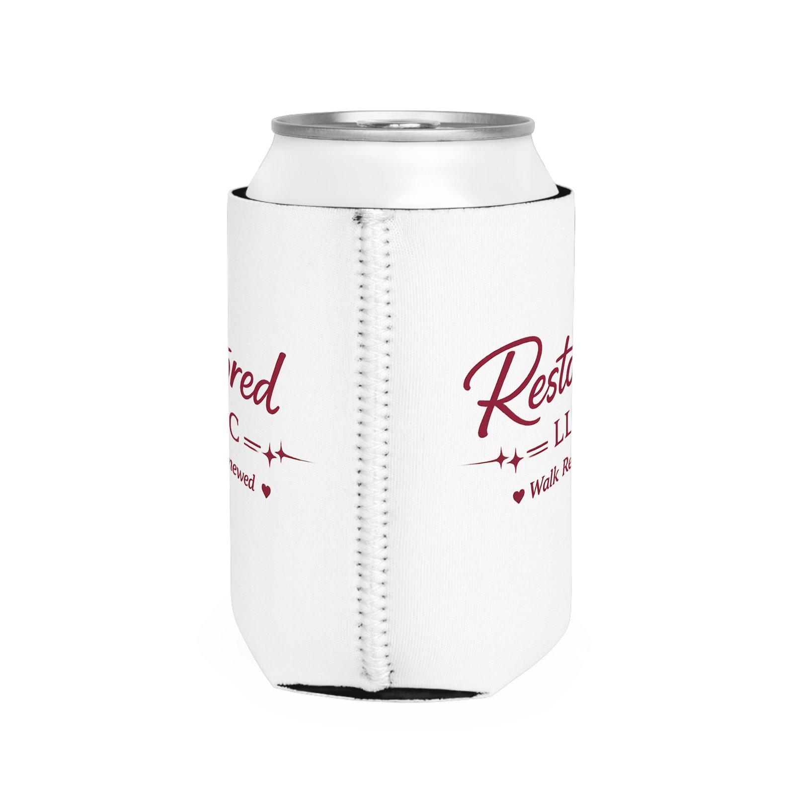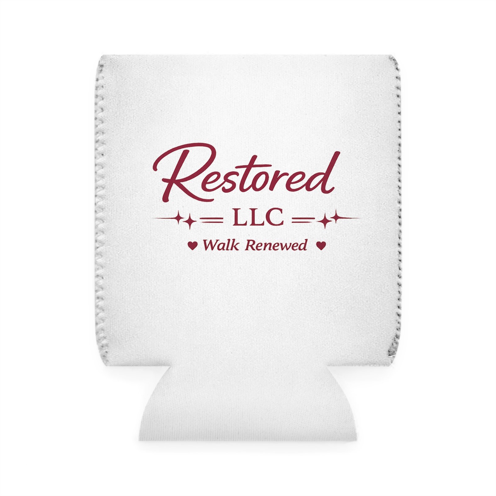 A soft, snug neoprene sleeve that keeps a 12 oz can chilled while showing a clean, uplifting logo. The white body with deep maroon script and subtle hearts reads “Restored LLC — Walk Renewed,” giving this can cooler a quiet, hopeful feel. Lightweight and collapsible, it tucks into a bag or glovebox for outings, meetings, or moments of quiet celebration. Durable slip-resistant neoprene and a black interior help lock in cold and resist slips, while vivid printing ensures the logo stays crisp through regular use. Note: seams may show light lines due to the printing process.