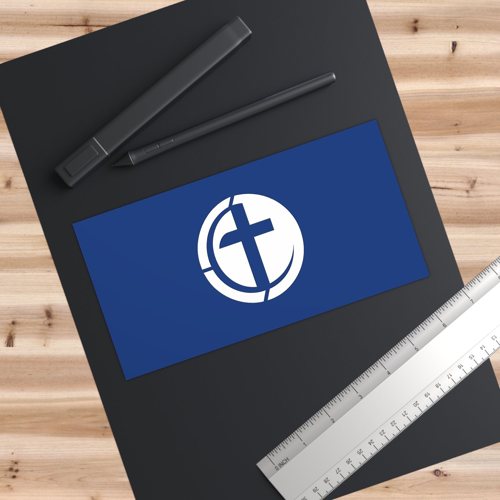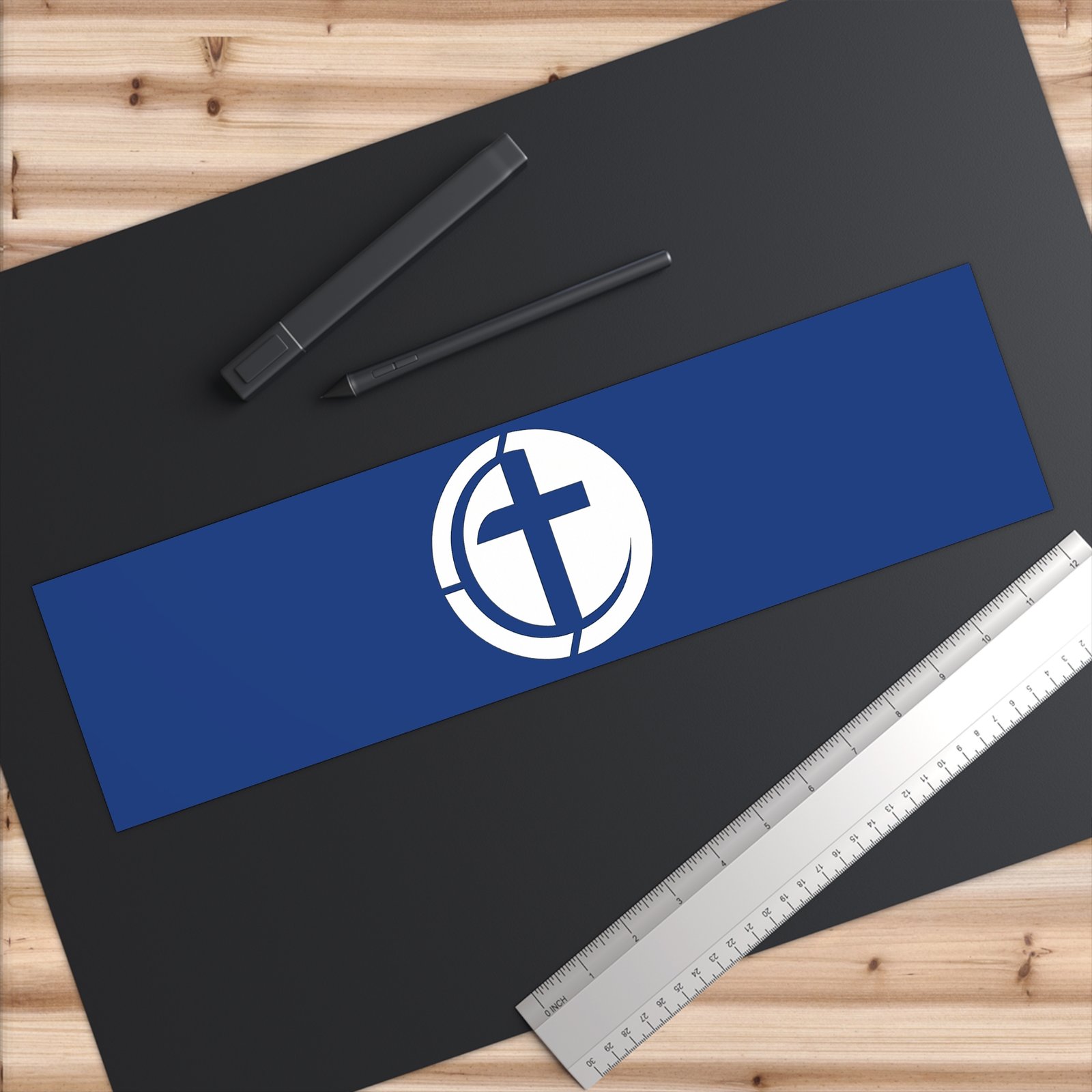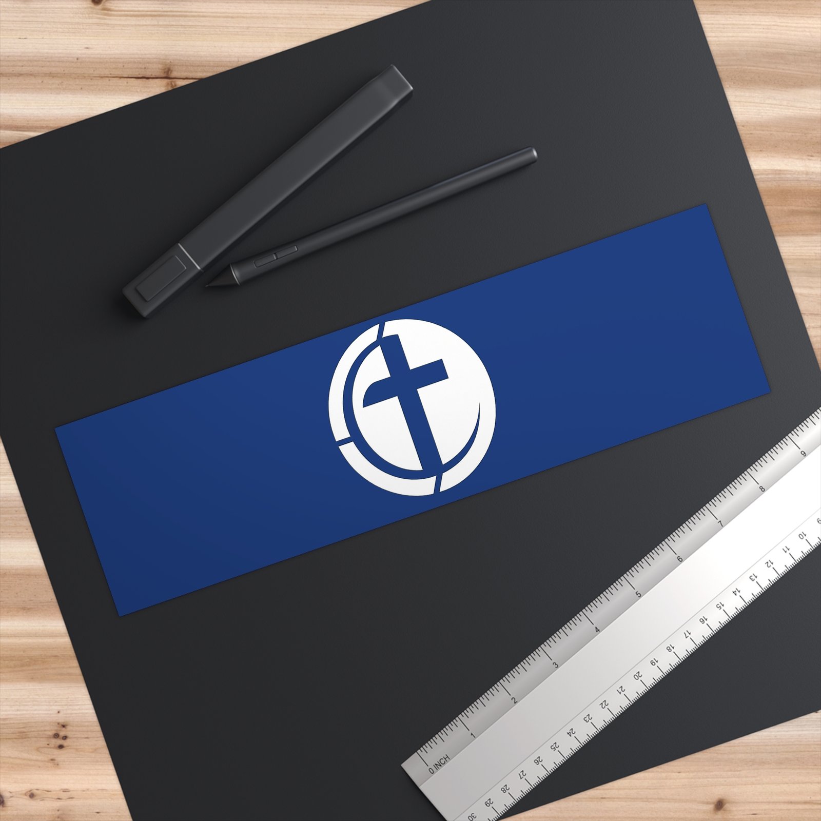 A durable, matte-finish bumper sticker that carries a simple, meaningful emblem — a stylized cross within a circular frame on a rich navy background. Weather-ready and subtly refined, it clings securely to bumpers, windows, water bottles, or instrument cases without drawing too much attention, while still signaling faith and community. The low-reflective matte finish keeps the design readable in daylight and reduces glare, and the UV protective laminate helps the colors stay true through sun and rain. Easy-peel backing and waterproof adhesive make application quick and long-lasting, so it becomes a quiet part of daily drives, weekend road trips, or church outreach activities.