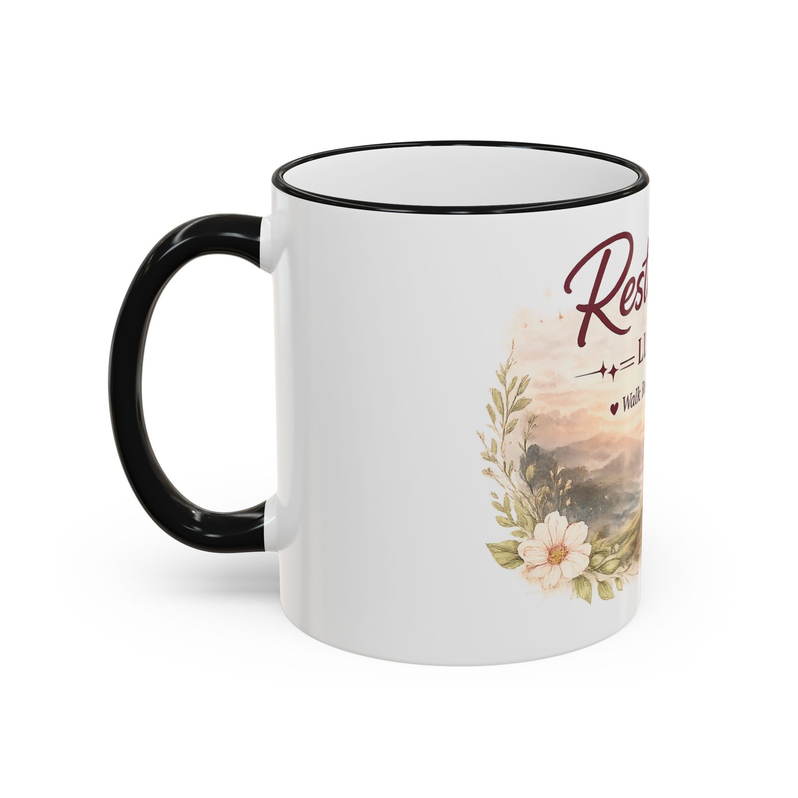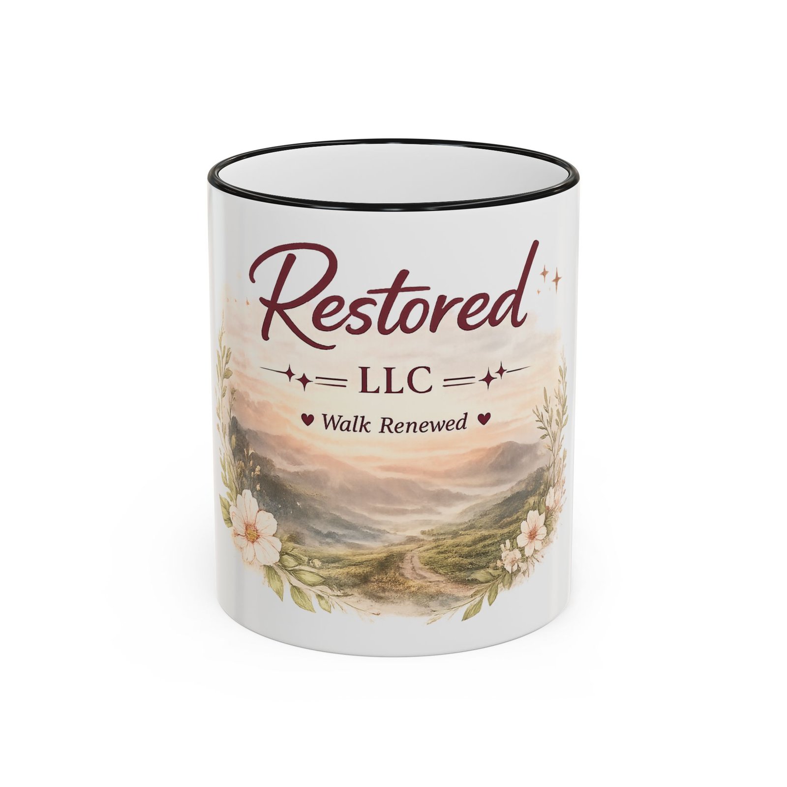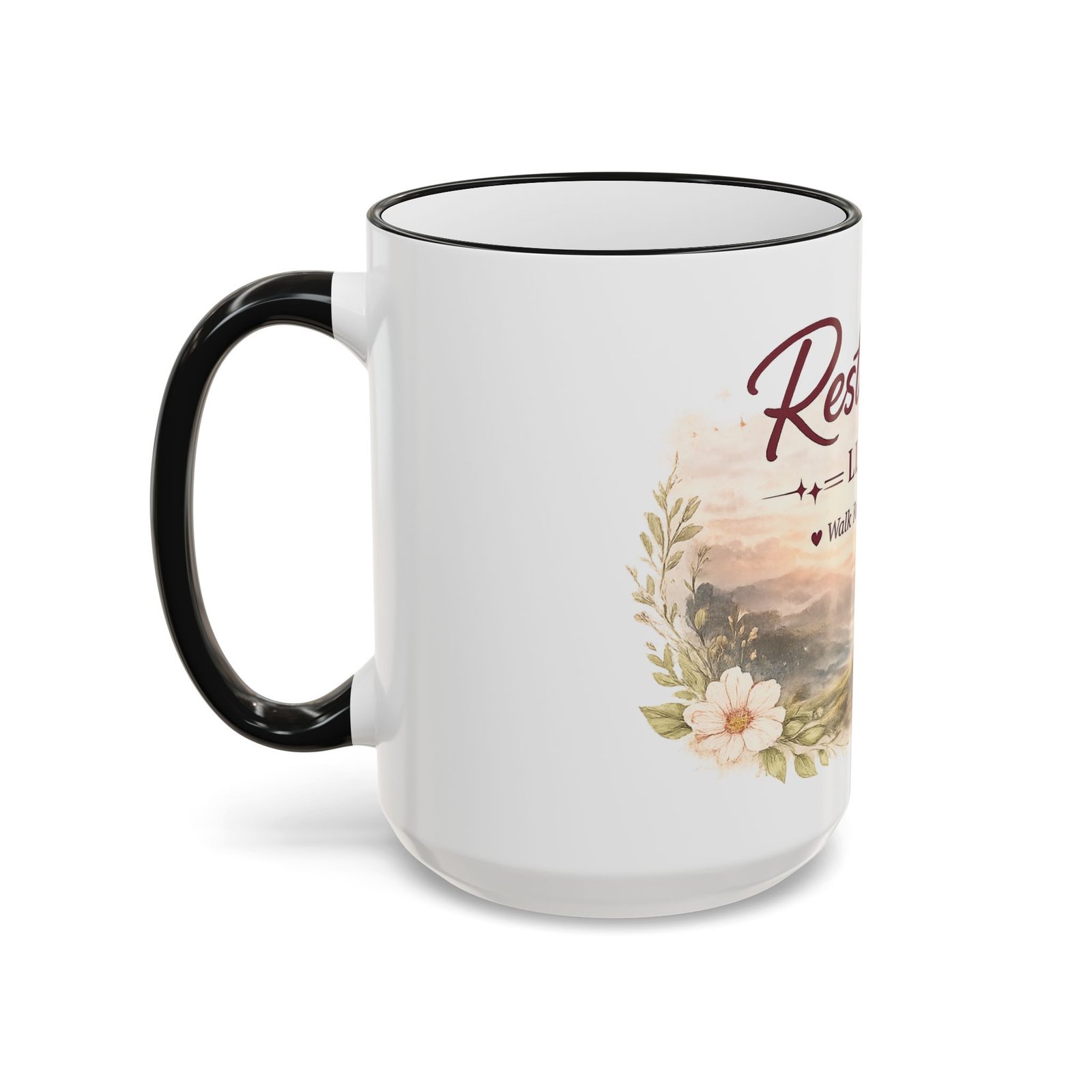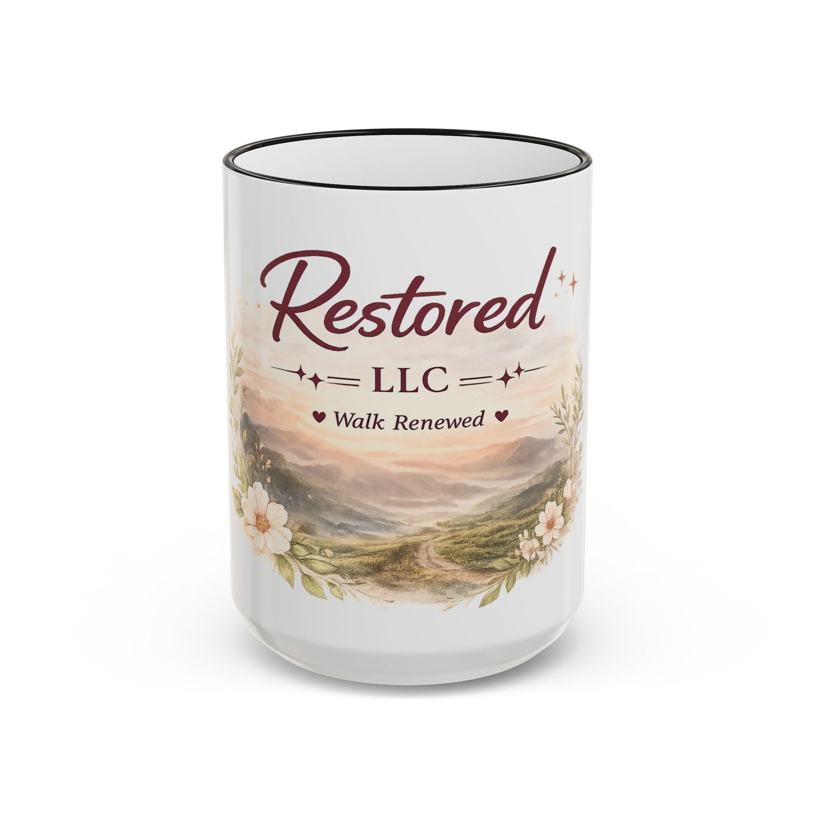Restored LLC ‘Walk Renewed’ Accent Rim Mug — Inspirational Floral Coffee Cup (11oz/15oz)