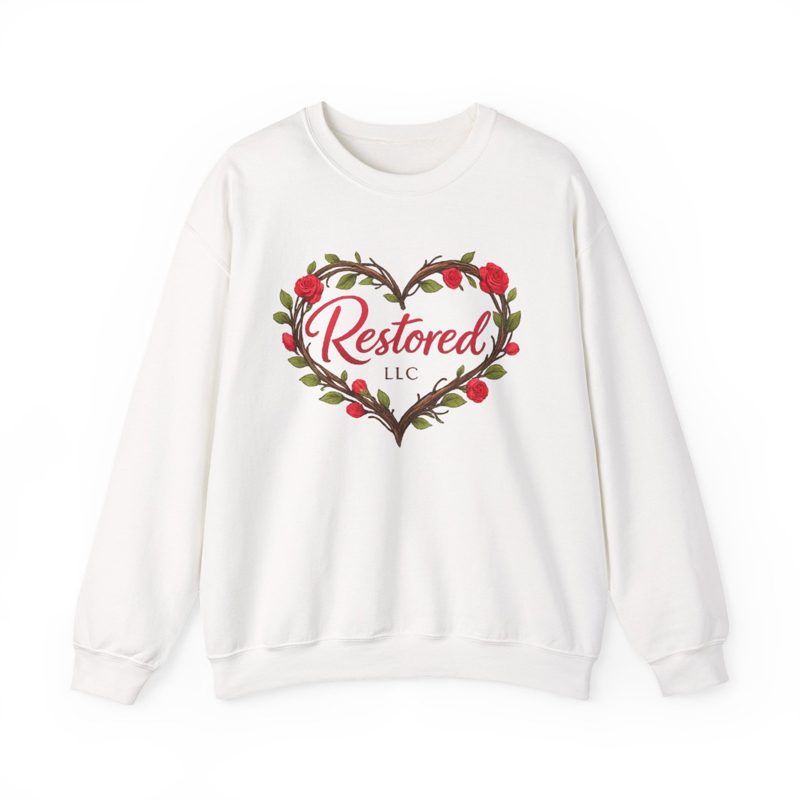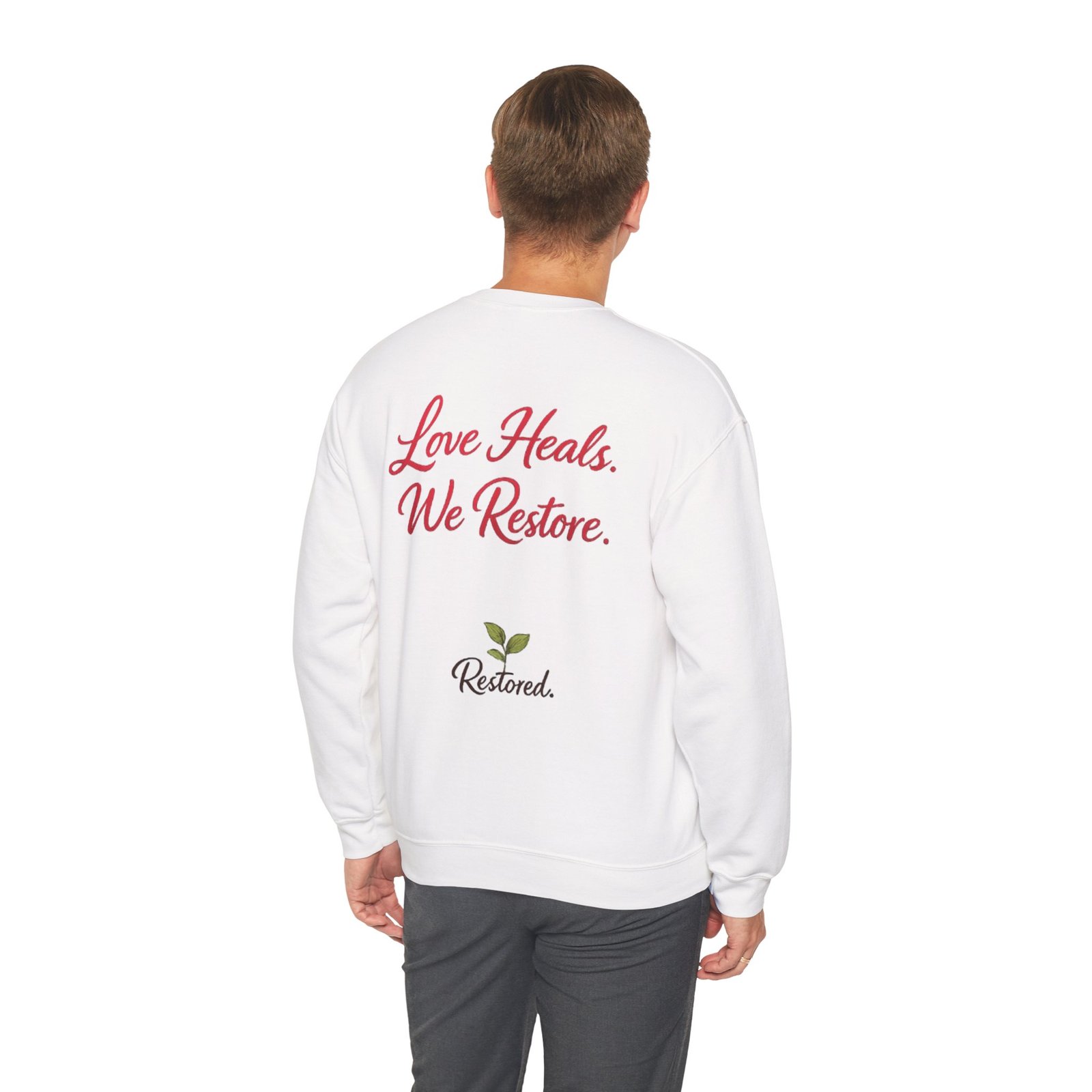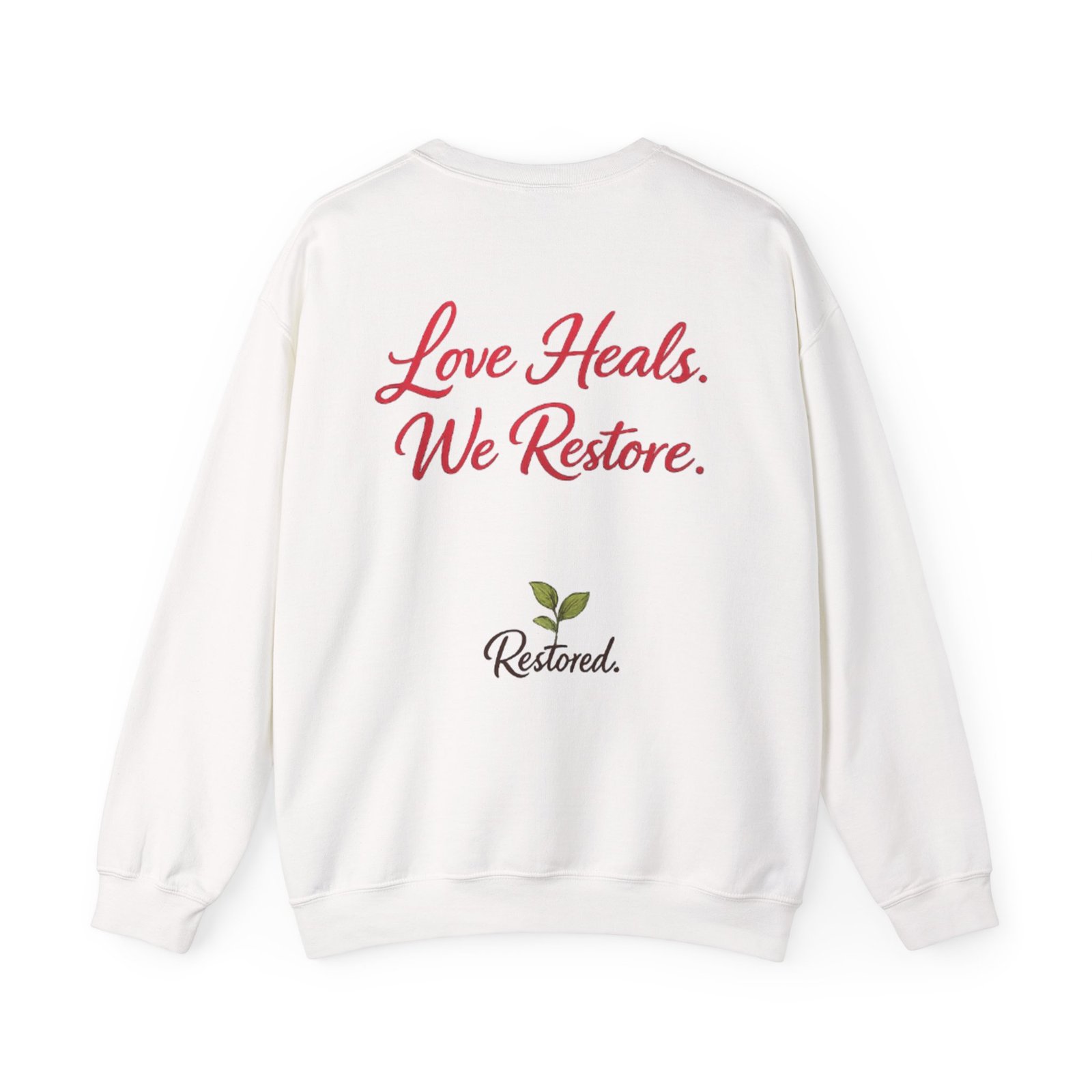 Soft, warm, and quietly hopeful — this crewneck wraps the wearer in gentle comfort while sharing a simple message: healing happens. A heart-shaped wreath of vines and roses sits over the chest, hand-lettered with “Restored” for an organic, handcrafted feel. The back carries the mantra “Love Heals. We Restore.” with a small sprouting logo below, turning the sweatshirt into a wearable statement of care and renewal. Lightweight enough for layering, durable enough for everyday wear, it becomes a cozy companion for recovery groups, volunteer meetups, or slow afternoons at home when you want to feel seen and steady.