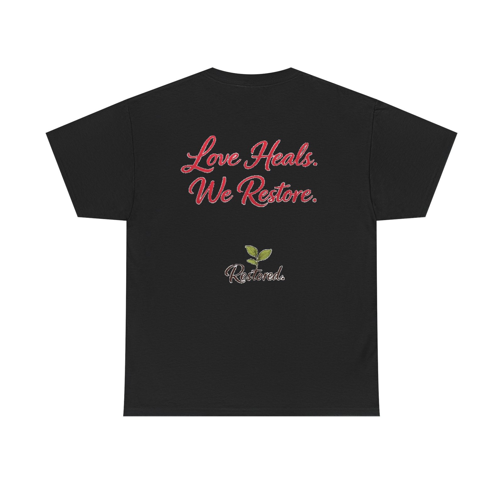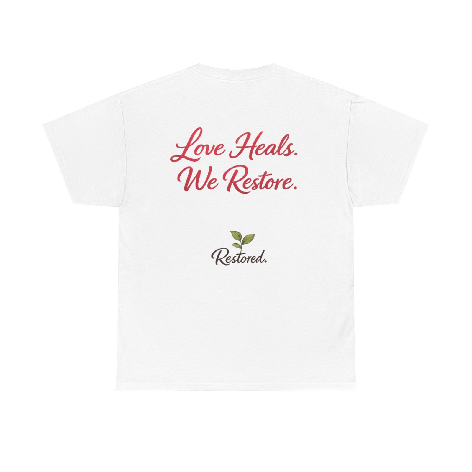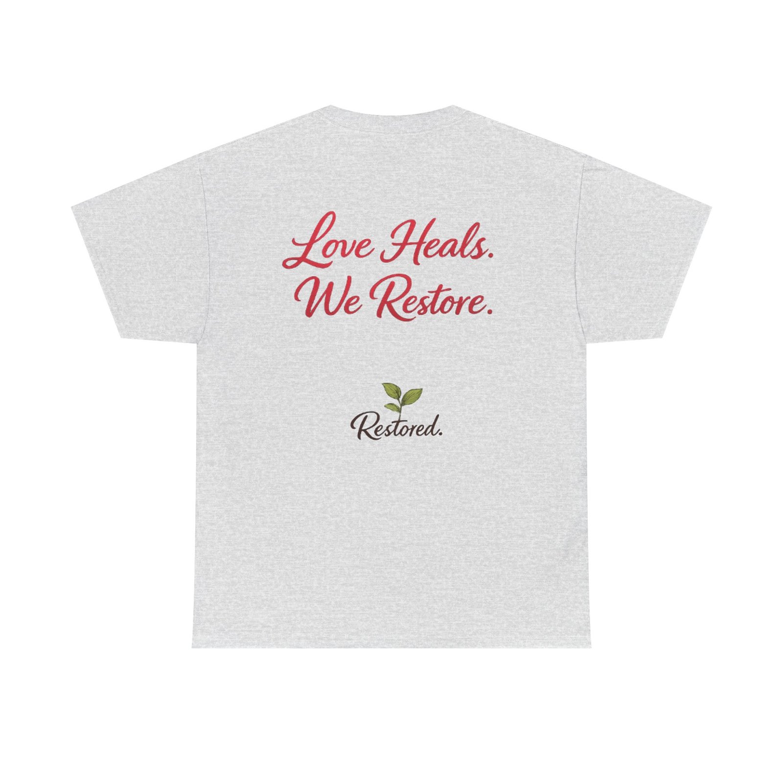 Soft, simple, and quietly hopeful — this classic tee carries a gentle message of healing. A wreath of hand-drawn leaves and rosebuds frames a warm script heart on the front, while the back reads “Love Heals. We Restore.” above a small green sprout logo. Wear it to volunteer shifts, recovery meetings, church gatherings, or slow coffee dates. The relaxed crew neck and midweight cotton let the message sit comfortably, not loud but true. It feels like an encouraging word from a friend: steady, positive, and meant to be shared.