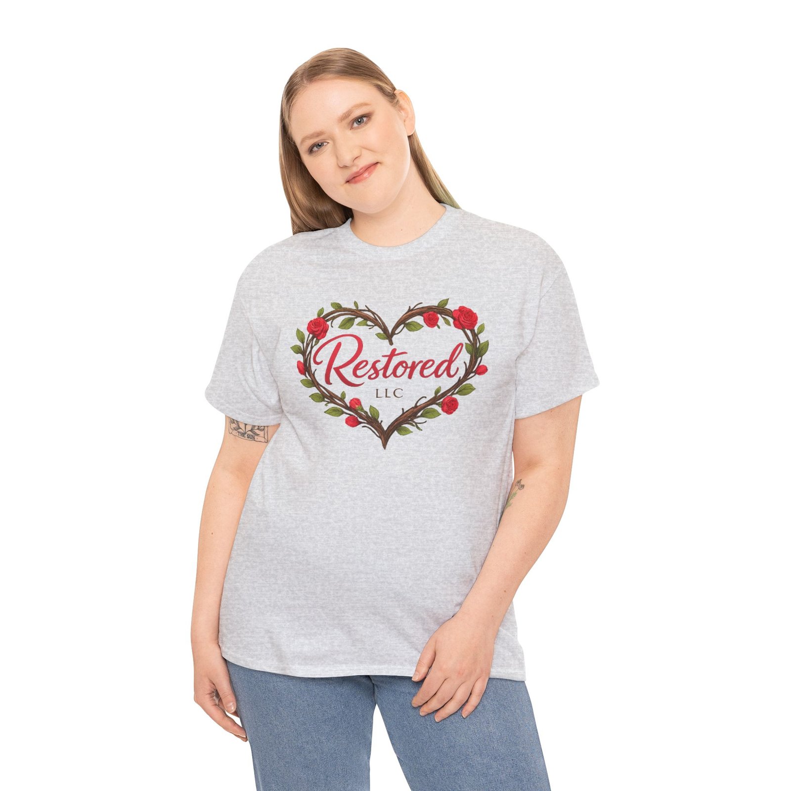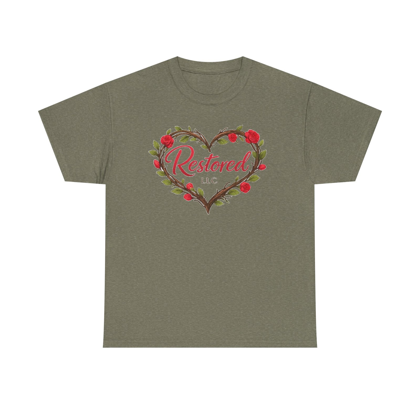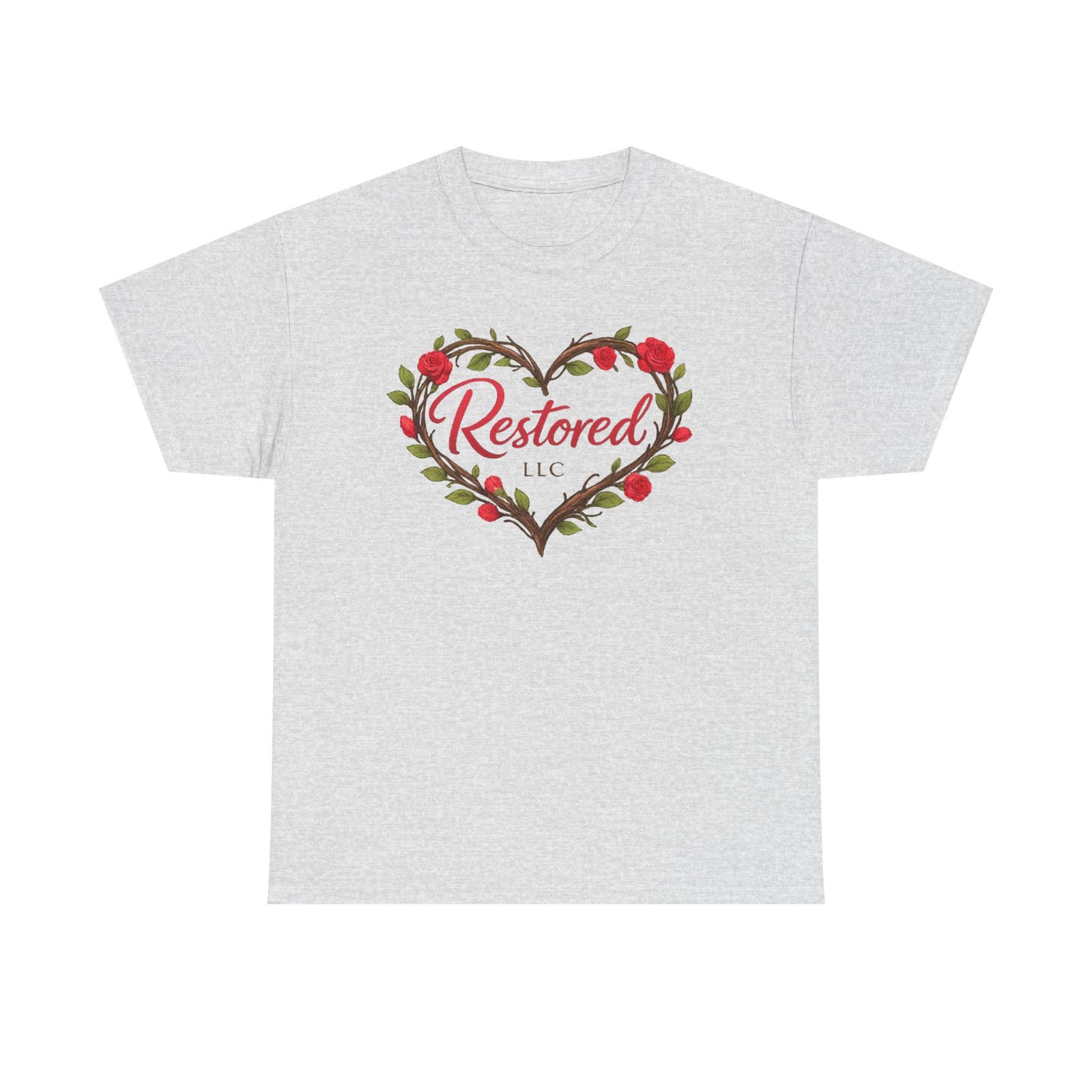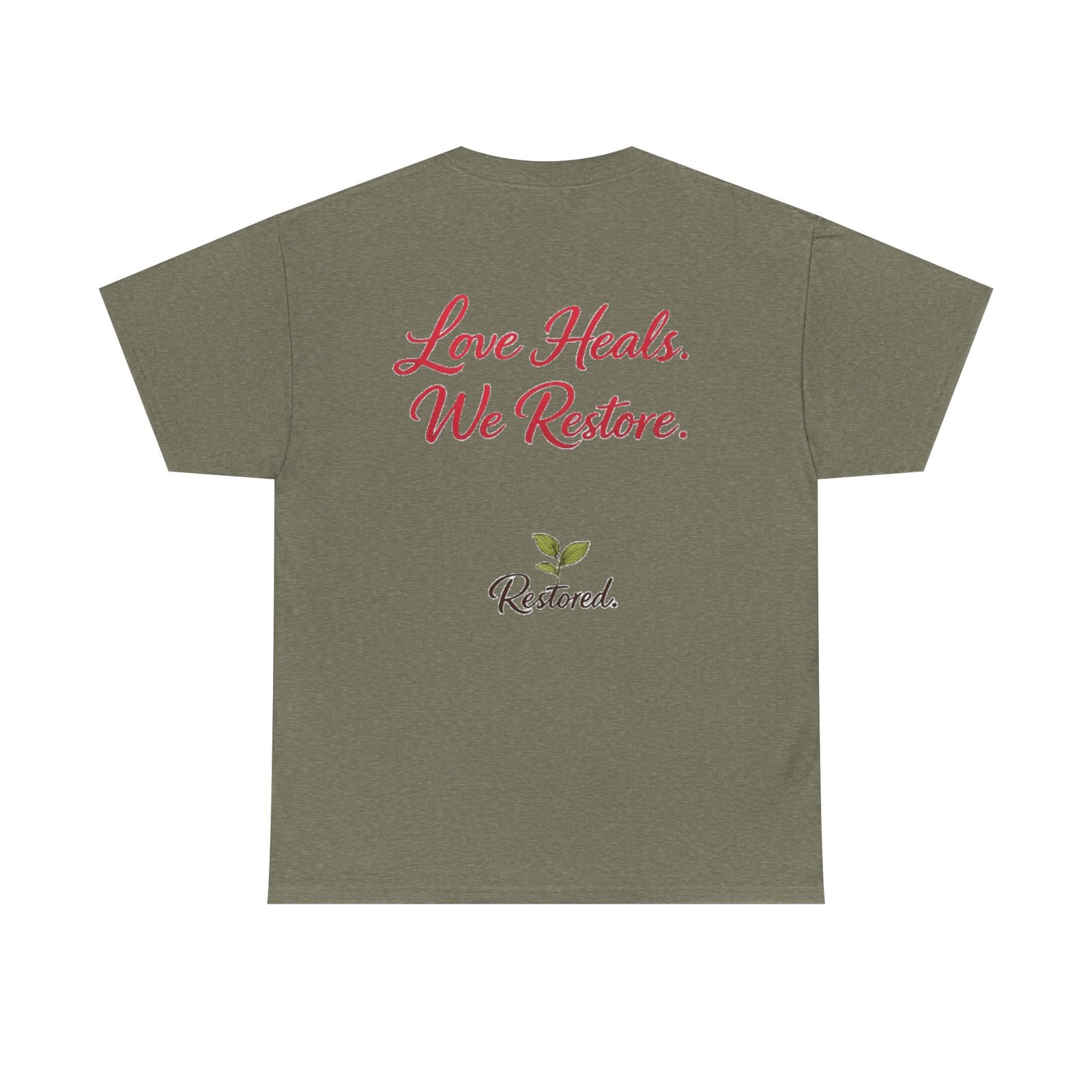Soft, simple, and quietly hopeful — this classic tee carries a gentle message of healing. A wreath of hand-drawn leaves and rosebuds frames a warm script heart on the front, while the back reads “Love Heals. We Restore.” above a small green sprout logo. Wear it to volunteer shifts, recovery meetings, church gatherings, or slow coffee dates. The relaxed crew neck and midweight cotton let the message sit comfortably, not loud but true. It feels like an encouraging word from a friend: steady, positive, and meant to be shared.